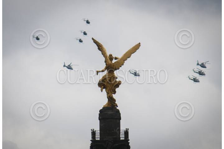 MÉXICO, D.F., 16SEPTIEMBRE2014.- Helicópteros sobrevuelan la ciudad en el tradicional desfile militar para conmemorar el 2014 aniversario del inicio de la guerra de Independencia. FOTO: DIEGO SIMÓN SÁNCHEZ /CUARTOSCURO.COM