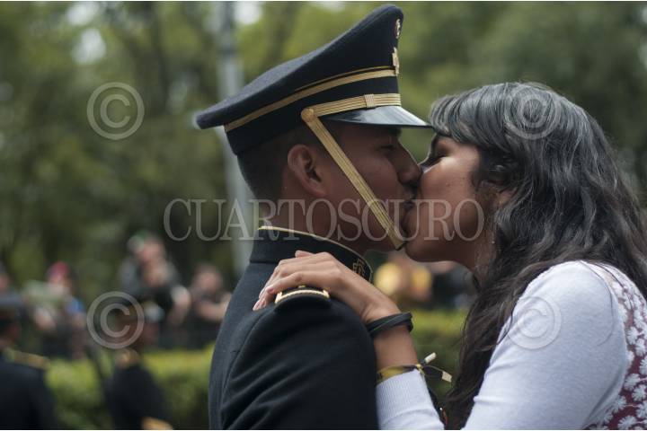 MÉXICO, D.F., 16SEPTIEMBRE2014.- Una chica besa a un cadete al término del desfile militar. Miles de personas observaron sobre Paseo de la Reforma el desfile militar conmemorativo por el 2014 aniversario del inicio de la guerra de Independencia. FOTO: DIEGO SIMÓN SÁNCHEZ /CUARTOSCURO.COM