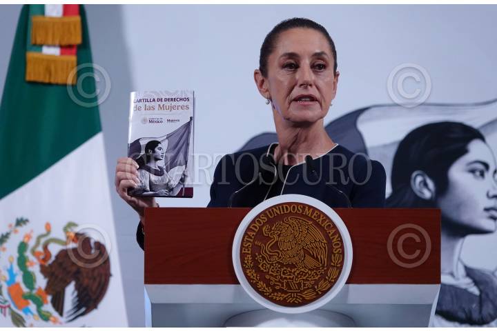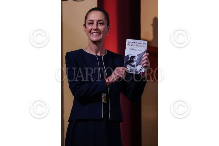 CIUDAD DE MÉXICO, 07MARZO2025.- Claudia Sheinbaum, presidenta de México, sostiene la Cartilla de Derechos de las Mujeres durante la conferencia “Mañanera del Pueblo” que le fue entregada por Citlallli Hernández, secretaria de Mujeres, y que serán entregadas a lo largo de la República para que todas conozcan sus derechos y los exijan. FOTO: GALO CAÑAS/CUARTOSCURO.COM