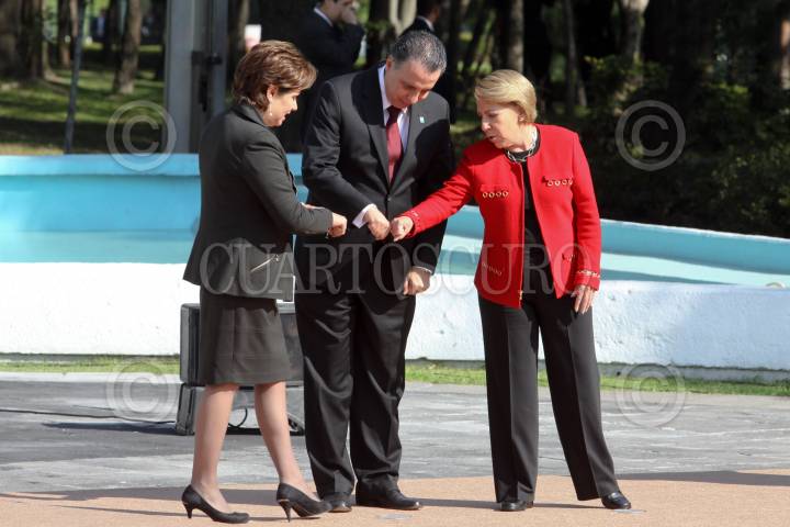 MÉXICO, D.F., 19OCTUBRE2010.- Los secretarios de estado Patricia Espinosa, Relaciones Exteriores, Bruno Ferrari, Economía y Georgina Kessel, Energía, comparan el color de sus pieles ante el intenso calor que se vivió en la ceremonia de bienvenida de Dean O. Barrow, primer ministro de Belice, que se realizó en la explaanda del monumento a "Don Francisco I. Madero" en la residencia oficial de Los Pinos. FOTO: MOISÉS PABLO/CUARTOSCURO.COM
