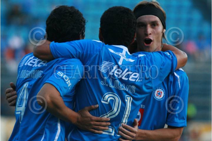 MÉXICO D.F., 24ENERO2009.- La Maquina de la Cruz Azul goleo 4-0 al Atlas en el Estadio Azul. Gerado Lugo festeja con sus compañeros una de sus tres anotaciones FOTO:SÁSHENKA GUTIÉRREZ/CUARTOSCURO.COM
