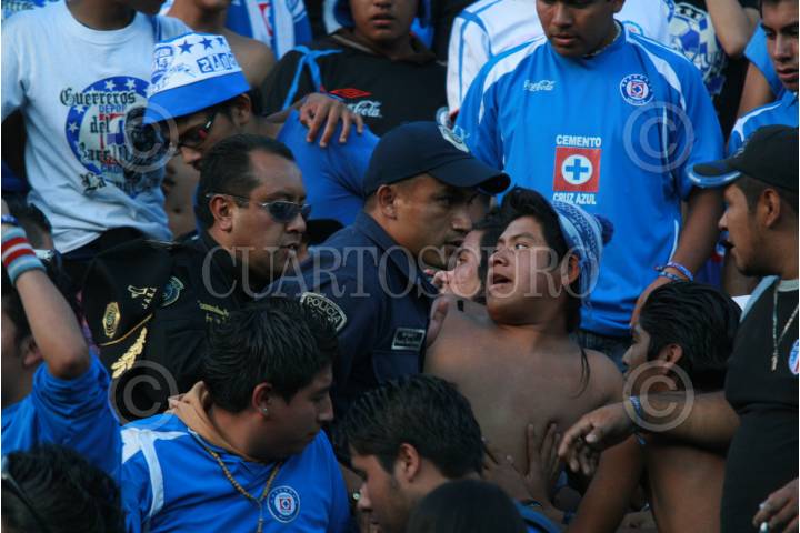 MÉXICO D.F., 24ENERO2009.- Durante el partido Cruz Azul-Atlas se dió un conato de bronca entre las porras y la policia. FOTO:SÁSHENKA GUTIÉRREZ/CUARTOSCURO.COM