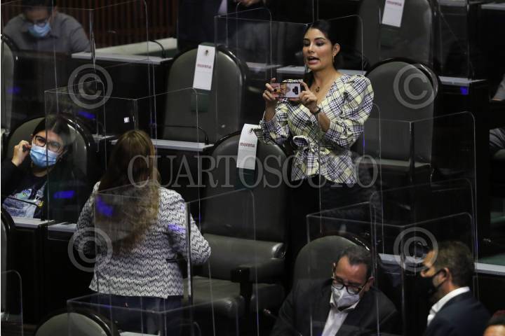 La diputada nayarita Geraldine Ponce toma una fotografía a una compañera de bancada.