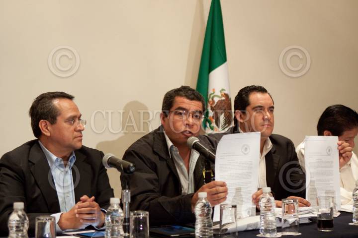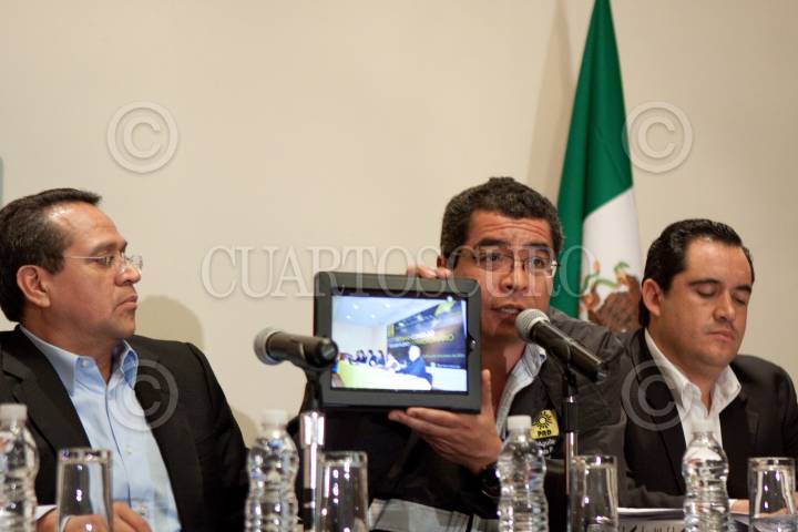 MÉXICO, D.F., 05ABRIL2013.- Juan Manuel Oliva, secretario adjunto del PAN, Vladimir Aguilar, secretario de Planeación del Partido de la Revolución Democrática, y Gerardo Espinoza, dirigente del PRD en Zacatecas, ofrecieron una conferencia de prensa sobre el rechazo del Instituto Electoral del Estado de Zacatecas ante la posibilidad de una alianza electoral entre el PRD y el PAN en aquel estado.. FOTO: MOISÉS PABLO /CUARTOSCURO.COM