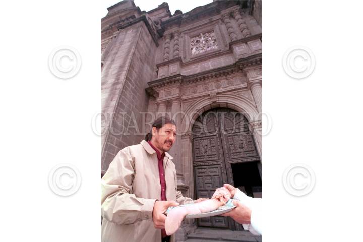 Gerardo Fernandez Noroña, lider de los deudores de la banca llevo una lengua de res a las afueras de la Catedral Metropolitana para protestar en contra del Cardenal Norberto Rivera, al cual califico de "lengua" pues en sus sermones no habla de los deudores. FOTO:Oswaldo Ramírez/CUARTOSCURO.COM