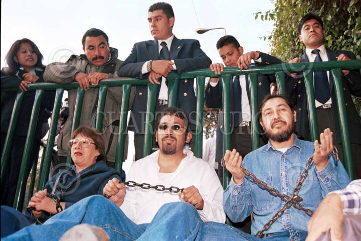 Gerardo Fernández Noroña, lider de los deudores de la banca, en companía de otros miembros de esta agrupación se encadenó a las rejas de acceso a los Pinos como protesta a los subsidios que el gobierno ha destinado al rescate bancario y a la nulidad que éste ha dado a las peticiones de los deudores. FOTO: Juan Pablo Zamora/CUARTOSCURO.COM
