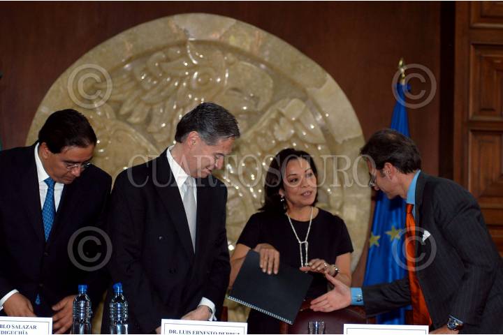 MEXDF27ENERO2004.- Pablo Salazar gobernador de Chiapas, Luis Ernesto Derbez secretario de Relaciones Exteriores, Josefina Vazquez titular de Sedesol y Germano Straneiro delegado de la Comisión europea durante la firma de convenio para apoyo de las comunidades rurales en Chiapas. FOTO: Germán Romero/CUARTOSCURO.COM