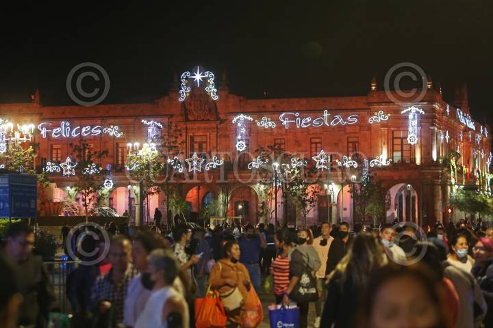 Imagen de la Presidencia de Guadalajara, adornada con el Ornato navideño en estas fechas decembrinas.