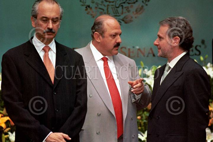 Francisco Gil Díaz, Reyes Taméz y Santiago Creel, secretarios de Economía, Educación y Gobernación respectivamente, durante el monto de guardia a la estatua de Belisario Dominguez en el Senado. FOTO: Juan Pablo Zamora/CUARTOSCURO.COM