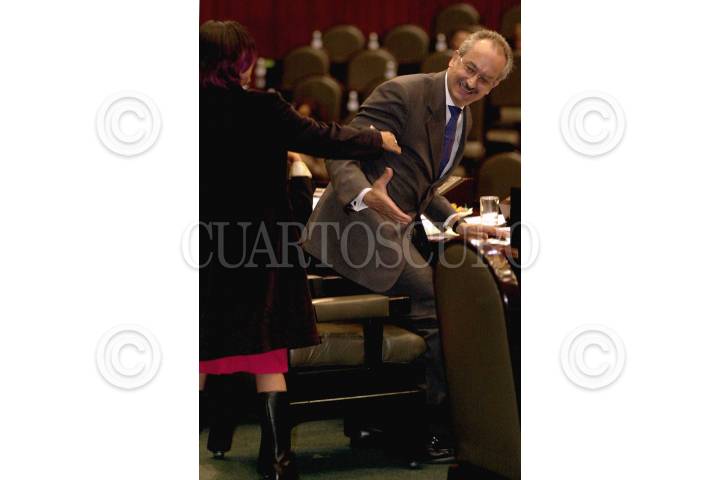 La legisladora perredista Miroslava García se despide del secretario de hacienda y Credito Público, Francisco Gil Díaz, en la comparecencia del segundo como parte de la glosa del II Informe de Gobierno del presidente Vicente Fox. FOTO: Victoria Valtierra/CUARTOSCURO.COM