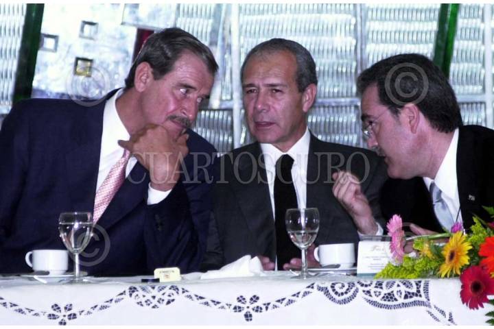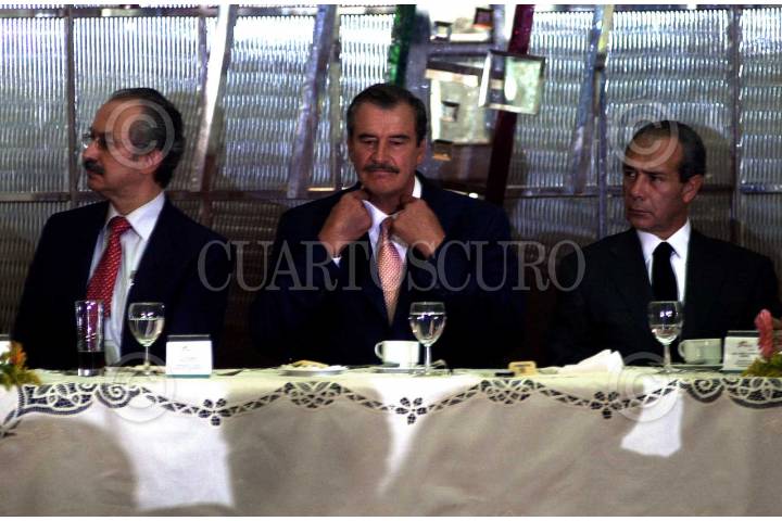 Durante la toma de protesta de directivos de CANACAR en el Campo Militar Marte, el presidente Fox declaró que México abrirá las puertas a los transportistas de Estados Unidos solo en condiciones de equidad con sus similares mexicanos. En la imagen, el presidente se acomoda el cuello de la camisa, le acompañan los secretarios de Economía y Comunicaciones y Transportes, Francisco Gíl Díaz y Pedro Cerisola. FOTO: Juan Pablo Zamora/CUARTOSCURO.COM