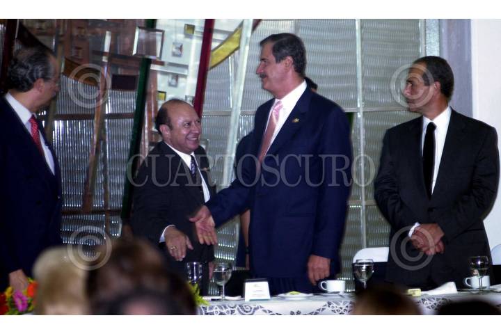 Vicente fox saluda al nuevo presidente de la CANACAR, León Arnulfo Flores Gonzalez, durante la toma de protesta de esta cámara en el Campo Militar Marte. Fox declaró que México abrirá las puertas a los transportistas de Estados Unidos solo en condiciones de equidad con sus similares mexicanos. FOTO: Juan Pablo Zamora/CUARTOSCURO.COM