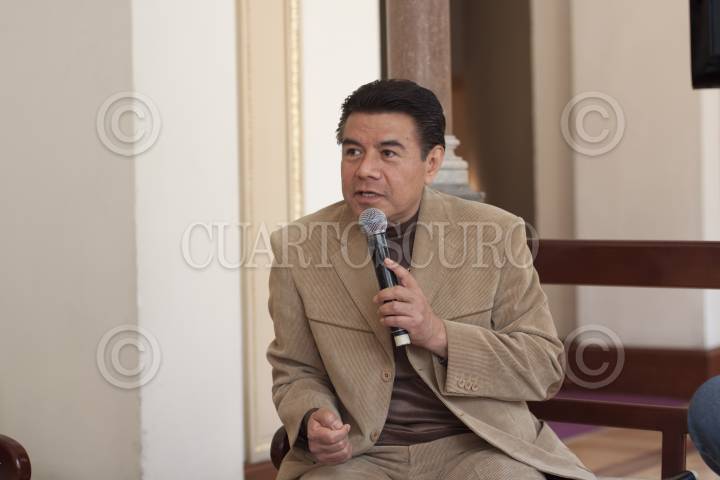 MÉXICO, D.F., 08FEBRERO2013.- El compositor Gil Rivera durante la conferencia de prensa de Jorge Massías, autor Lastima que seas ajena y Nube Viajera, entre otras, en la cual se anunció su concierto para conmemorar sus 40 años como creador de canciones, el espectáculo se realizará el 15 de febrero a las 20:00 en el Teatro Esperanza Iris y se llamará "Con la misma piedra". FOTO: MOISÉS PABLO / CUARTOSCURO.COM