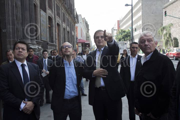 MÉXICO, D.F., 02OCTUBRE2012.- Mario Delgado, senador del PRD, Intin Muñoz, director general del Fideicomiso del Centro Histórico, Marcelo Ebrard Casaubón, Jefe de Gobierno, y Salvador Martínez Della Rocca, secretario de Educación del GDF, conversan sobre la ampliación de las banquetas que se estan realizando en la avenida Pino Suárez afuera del Museo de la Ciudad de México. FOTO: MOISÉS PABLO /CUARTOSCURO.COM