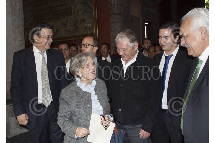 MÉXICO, D.F., 02OCTUBRE2012.- Marcelo Ebrard Casaubón, Jefe de Gobierno, Inti Muñoz, director general del Fideicomiso del Centro Histórico, la escritora Elena Poniatowska, Salvador Martínez Della Rocca, secretario de Educación, y Gilberto Guevara Niebla, líder estudiantil del 68, durante una ceremonia conmemorativa de la matanza del 02 de octubre de 1968 en la Plaza de las Tres Culturas, que se realizó en el Museo de la Ciudad de México. FOTO: MOISÉS PABLO /CUARTOSCURO.COM