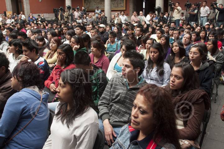 MÉXICO, D.F., 02OCTUBRE2012.- Jóvenes durante la ceremonia conmemorativa de la matanza del 02 de octubre de 1968 en la Plaza de las Tres Culturas, la cual se realizó el Museo de la Ciudad de México. FOTO: MOISÉS PABLO /CUARTOSCURO.COM