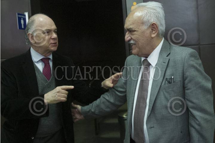 CIUDAD DE MÉXICO, 07MARZO2018.- El historiador Enrique Krauzer y Gilberto Guevara Niebla, líder estudiantil de los sesenta, durante la presentación del programa conmemorativo por los 50 años del Movimiento Estudiantil de 1968 "M68", que se realizó en el Centro Cultural Tlatelolco FOTO: MOISÉS PABLO /CUARTOSCURO.COM