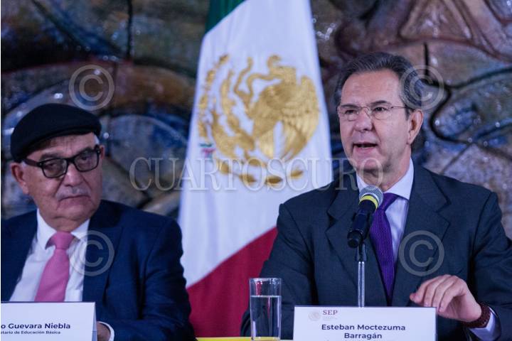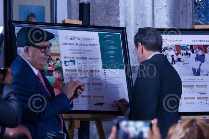 CIUDAD DE MÉXICO, 27MAYO2019.- Gilberto Guevara Niebla, subsecretario de Educación Básica, y Esteban Moctezuma Barragán, secretario de Educación Pública, durante la presentación del Calendario Escolar 2019-2020, el cual contará con 190 días y busca favorecer la convivencia familiar. FOTO: GALO CAÑAS /CUARTOSCURO.COM