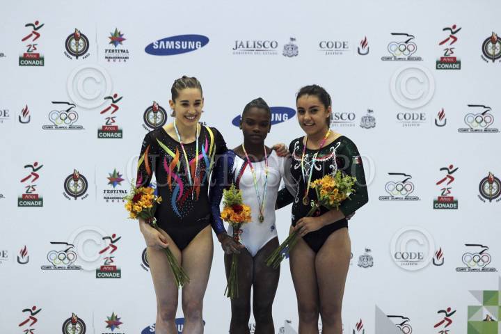 GUADALAJARA, JALISCO, 17JULIO2014.- Hoy en el Complejo Panamericano de Gimnasia se llevo a cabo el Festival Deportivo Panamericano 2014, en donde se realizaron las actividades de Gimnasia Artística Femenil, en donde la primera posición fue para Yesenia Ferrera de Cuba, la segunda posición para Ayelen Tarabini de Argentina y la tercera posición para Ahtziri Sandoval de México. FOTO: FERNANDO CARRANZA GARCIA /CUARTOSCURO.COM