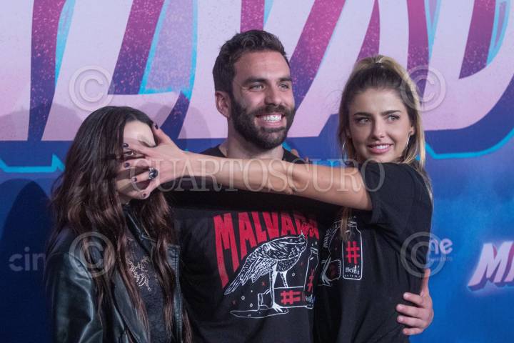 Los actores Manuel Calderón, Gisselle Kuri, y Alex Fernández, durante la rueda de prensa de la cinta "Malvada".