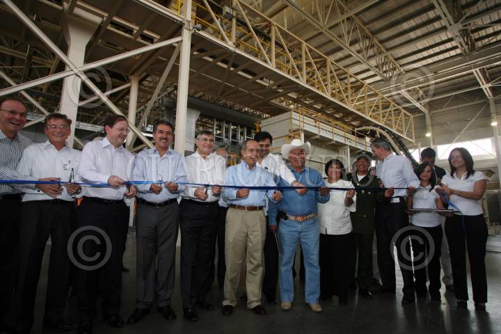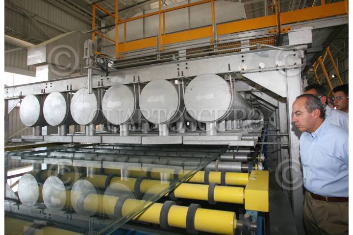 MUNICIPIO DE AYALA, MORELOS., 29ENERO2008. El presidente de México Felipe Calderón Hinojosa durante el corte de liston en la inauguración de la línea flota ll de la empresa Saint- Globain Glass México, que tuvo lugar en este municipio. FOTO: ALFREDO GUERRERO/CUARTOSCURO.COM