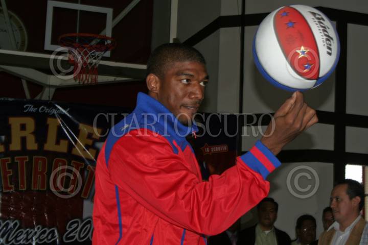 MÉXICO D.F., 08OCTUBRE2008.- Bucket Blakes, integrante del equipo de baloncesto, Harlem Globetrotters, durante la conferencia que realizarón con el fin de promocionar su proxima presentación en el Palacio de los Deportes. FOTO: ENRIQUE ORDÓÑEZ/CUARTOSCURO.COM