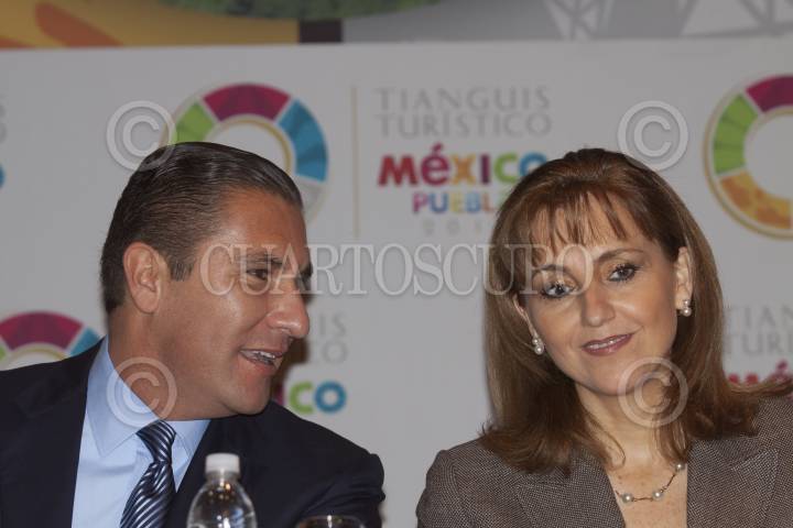 MÉXICO, D.F., 30OCTUBRE2012.- Rafael Moreno Valle Rosas, gobernador de Puebla, y Gloria Guevara, secretaria de Turismo, durante la presentación oficial del Tianguis Turístico México Puebla 2013. FOTO: MOISÉS PABLO /CUARTOSCURO.COM