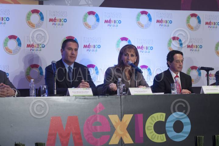 MÉXICO, D.F., 30OCTUBRE2012.- Rafael Moreno Valle Rosas, gobernador de Puebla, Gloria Guevara, secretaria de Turismo, y Carlos Joaquín González, coordinador de turismo del equipo de transición del Enrique Peña Nieto, durante la presentación oficial del Tianguis Turístico México Puebla 2013. FOTO: MOISÉS PABLO /CUARTOSCURO.COM