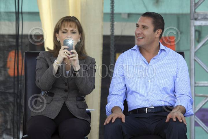 CHIGNAHUAPAN, PUEBLA, 30OCTUBRE2012.- Gloria Guevara Manzo, secretaria federal de turismo, entregó el reconocimiento de Pueblo Mágico al municipio de Chignahuapan en manos del gobernador Rafael Moreno Valle y del presidente municipal Luis Olvera. FOTO: HILDA RÍOS /CUARTOSCURO.COM
