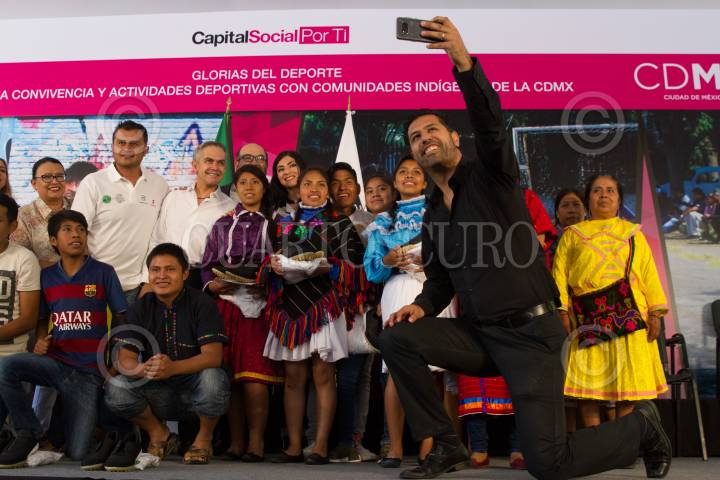 CIUDAD DE MÉXICO, 21JUNIO2017.- Miguel Ángel Mancera, Jefe de Gobierno, entregó equipo deportivo a jóvenes que practican fútbol en el programa deportivo "Glorias del Deporte", que se realizó en Plaza Tlaxcoaque. En la imagen el ex futbolista Ángel “Rambo” Sosa, uno de los impulsores de este programa, se toma una foto con los beneficiarios. FOTO: MOISÉS PABLO /CUARTOSCURO.COM