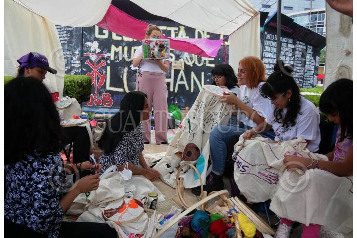 Mujeres y familiares de víctimas de desaparición forzada y feminicidio así como colectivas feministas y sobrevivientes mantienen plantón de guardia hasta resolver el acuerdo de mantener la estatua de la mujer colocada por colectivas hace un año. Ayer hubo junta con representantes del Gobierno y se acordó que quizás podrían convivir ambas estatuas juntas.