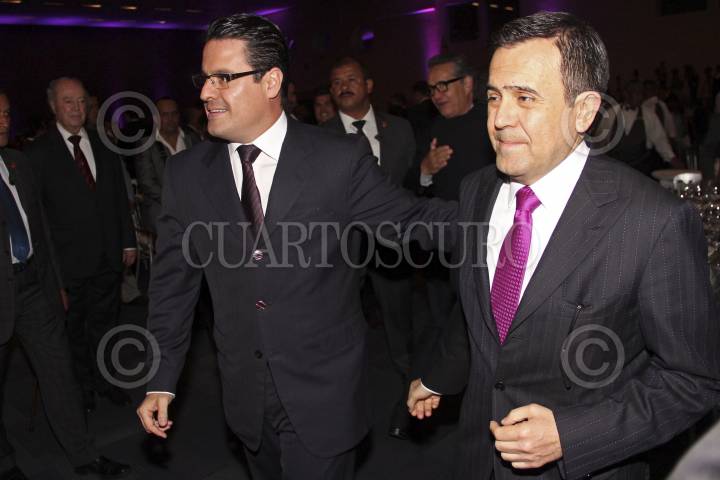 GUADALAJARA, JALISCO, 12JUNIO2013.- Ildefonso Guajardo Villarreal, Secretario de Economía; y Jorge Aristoteles Sandoval, Gobernador del Estado; en el evento en donde rindió protesta al nuevo Titular del Consejo de Cámaras Industriales de Jalisco (CCIJ), Juan Alonso Niño Cota y a su gabinete. También entregaron un reconocimiento al Presidente del Consejo Arancia Industrial, Ignacio Aranguren Castiello, por ser el primer coordinador del (CCIJ) hace 50 años. FOTO: FERNANDO CARRANZA GARCÍA /CUARTOSCURO.COM