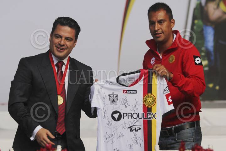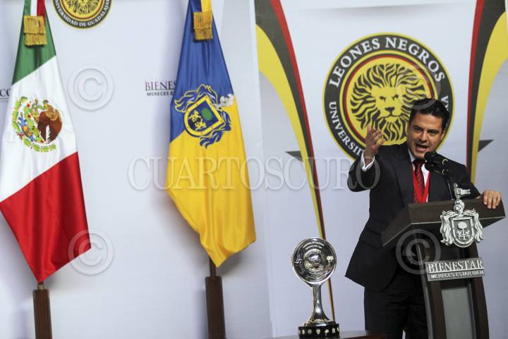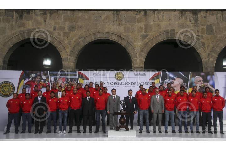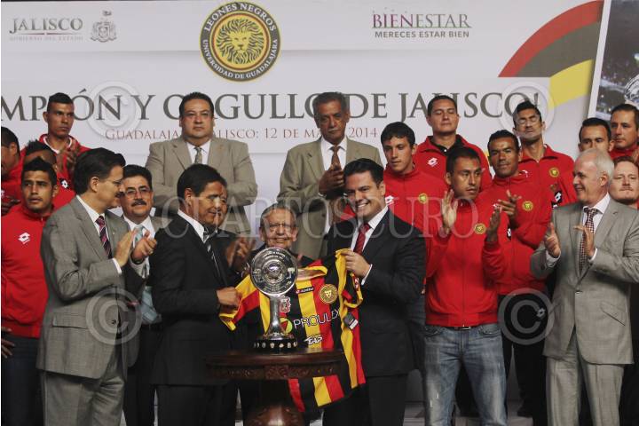 GUADALAJARA, JALISCO, 12MAYO2014.- Jorge Aristóteles Sandoval Díaz, gobernador de Jalisco, recibió en el Palacio de Gobierno del Estado a dirigentes universitarios, cuerpo técnico e integrantes del equipo campeón de la Liga de Ascenso MX 2013-2014, los Leones Negros de la Universidad de Guadalajara U. de G.; al final el gobernador y los presentes se tomaron la fotografía oficial. FOTO: FERNANDO CARRANZA GARCIA /CUARTOSCURO.COM