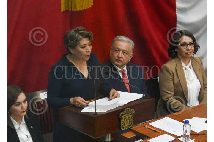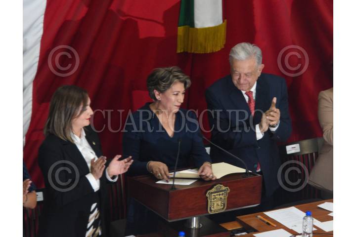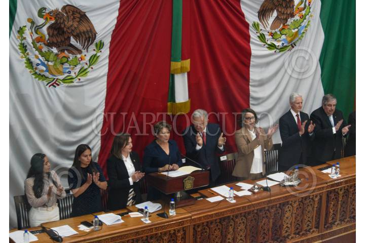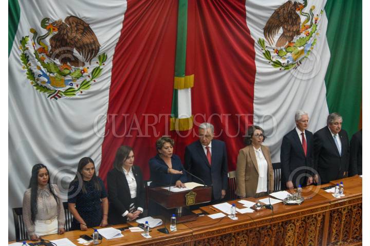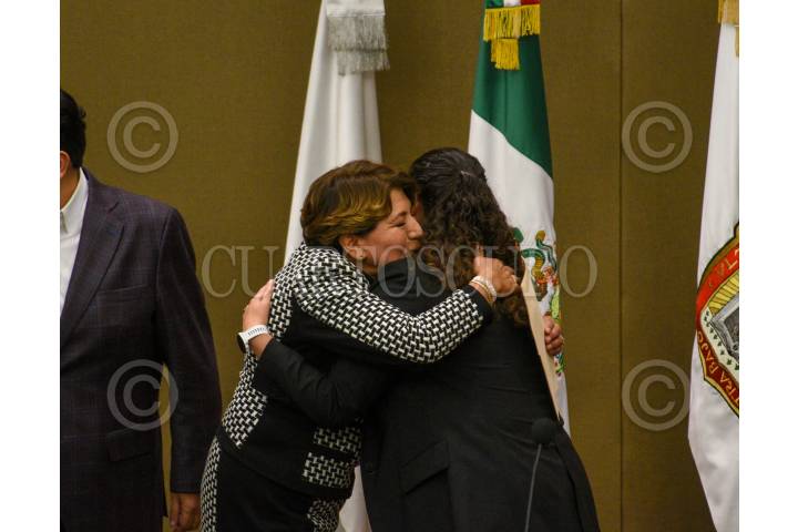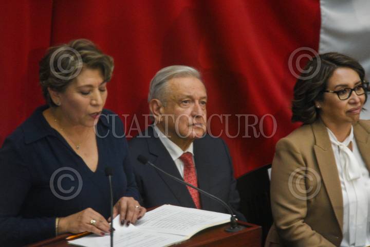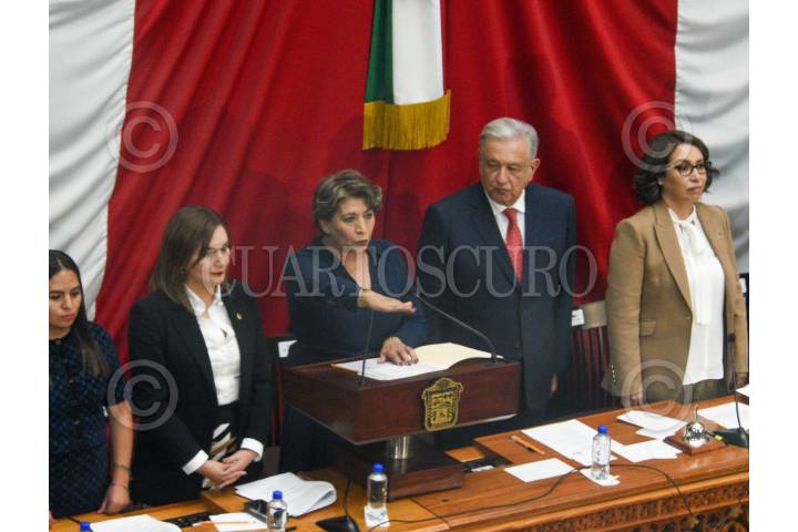 TOLUCA, ESTADO DE MÉXICO, 14SEPTIEMBRE2023.- Delfina Gómez Álvarez tomó protesta como Gobernadora del Estado de México durante la Sesión Solemne de la LXI Legislatura Local, estuvo acompañada por el Presidente de México Andrés Manuel López Obrador. FOTO: CRISANTA ESPINOSA AGUILAR /CUARTOSCURO.COM