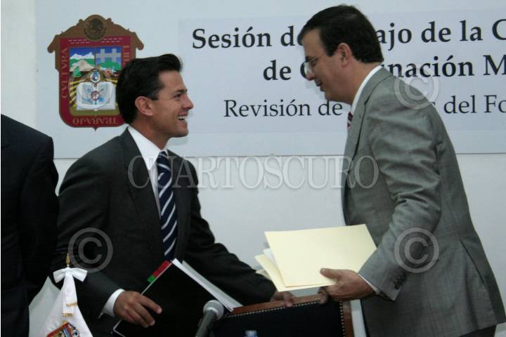 MÉXICO, D.F. 10JULIO2007.- El jefe de goberno capitalino, Marcelo Ebrard Casaubón y el gobernador de Estado de México, Enrique Peña Nieto durante la firma de acuerdo para la creación de la comisión metropolitana de finanzas. FOTO: PAOLA HIDALGO/CUARTOSCURO.COM