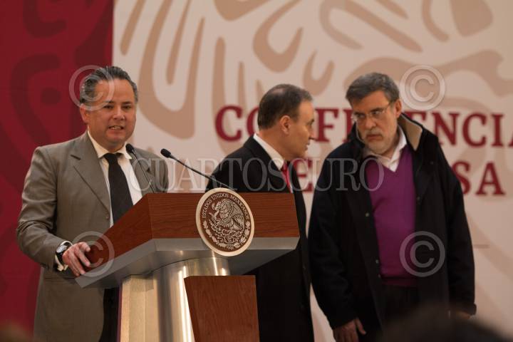 CIUDAD DE MÉXICO, 17ENERO2019.- Santiago Nieto García, titular de la Unidad de Inteligencia Financiera (UIF); Alfonso Durazo Montaño, secretario de Seguridad Publico y Julio Scherer Ibarra, consejero Jurídico del Ejecutivo Federal, durante onferencia de prensa para detallar los avances en la estrategia contra el robo de combustible, el secretario de Seguridad reiteró que se estableció un Comité de inteligencia interinstitucional para cumplir siete de objetivos principales. FOTO: ANDREA MURCIA /CUARTOSCURO.COM