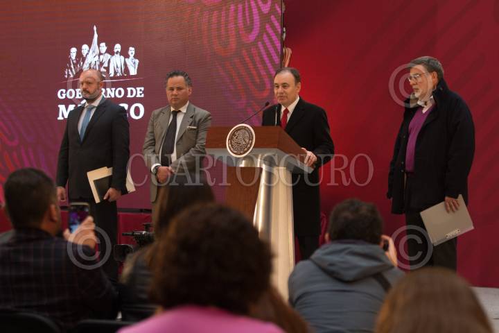 CIUDAD DE MÉXICO, 17ENERO2019.- Alfonso Durazo Montaño, secretario de Seguridad Publica; Julio Scherer Ibarra, consejero Jurídico del Ejecutivo Federal; Santiago Nieto García, titular de la Unidad de Inteligencia Financiera (UIF) y Roberto Ochoa, subprocurador de la FGR, presidieron conferencia de prensa para detallar los avances en la estrategia contra el robo de combustible, el secretario de Seguridad reiteró que se estableció un Comité de inteligencia interinstitucional para cumplir siete de objetivos principales. FOTO: ANDREA MURCIA /CUARTOSCURO.COM