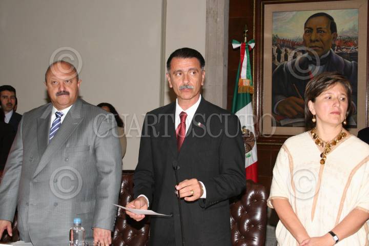 MÉXICO D.F. 10MARZO2006.- Reyes Tàmez Guerra, secretario de Educaciòn Pùblica, Carlos Abascal, secretario de Gobernación y Xòchitl Gàlvez Ruiz de la Comision Nacional para el Desarrollo de los Pueblos Indìgenas, durante la inauguraciòn de la Instalacion de la Comision Intersecretarial para los Festejos del Benemèrito del Natalicio de Don Bènito Juàrez. FOTO: Diego Gallegos/CUARTOSCURO.COM