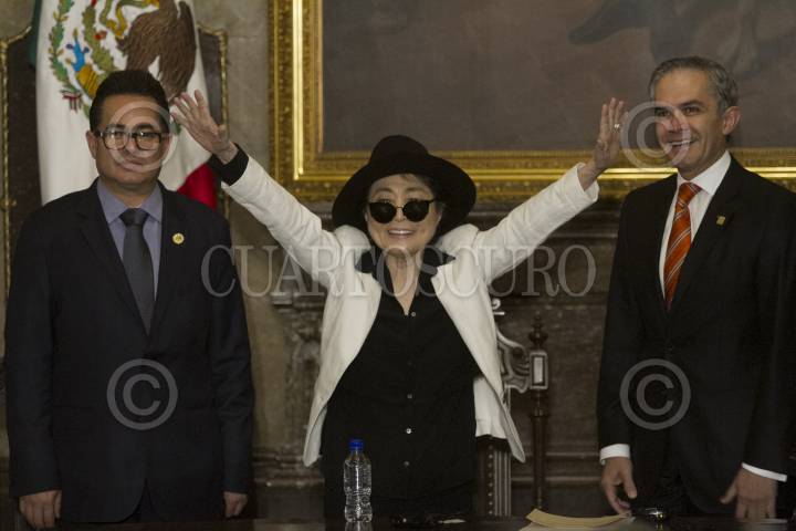 CIUDAD DE MÉXICO, 03FEBRERO2016.- La artista plástica Yoko Ono, legendaria por ser la pareja sentimental del músico John Lennon, fue nombrada como visitante distinguida de la ciudad en el salón de Cabildos del Antiguo Palacio del Ayuntamiento, el pergamino se lo entregó el Jefe de Gobierno Miguel Ángel Mancera. FOTO: MOISÉS PABLO /CUARTOSCURO.COM