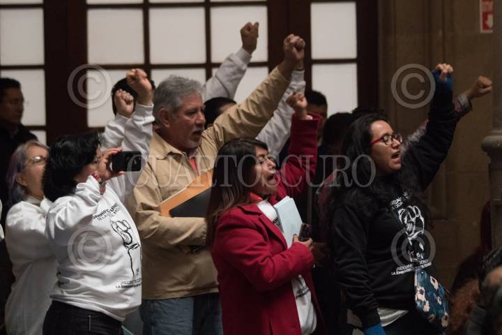 CIUDAD DE MÉXICO, 16DICIEMBRE2018.- Afectados por los sismos de septiembre de 2017 gritan consignas durante la presentación del "Plan Integral para la Reconstrucción de la Ciudad de México", en el Antiguo Palacio del Ayuntamiento. FOTO: MOISÉS PABLO /CUARTOSCURO.COM
