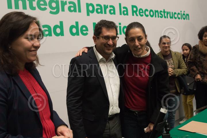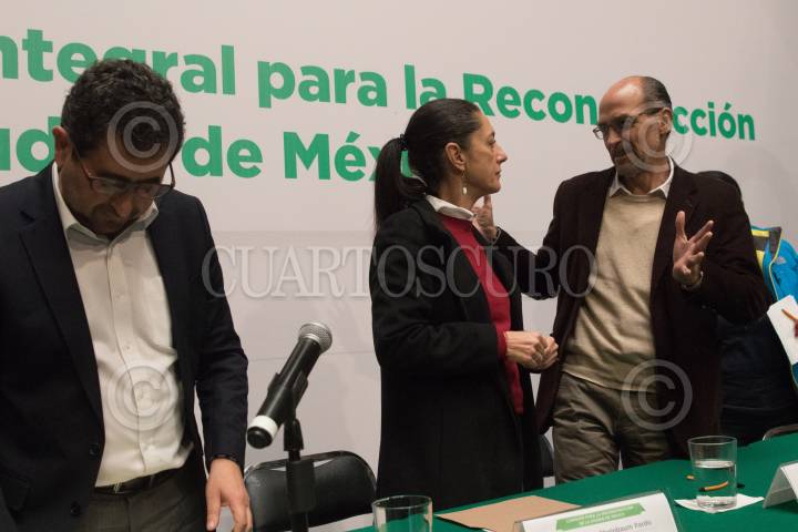 CIUDAD DE MÉXICO, 16DICIEMBRE2018.- César Cravioto, comisionado para la Reconstrucción; Claudia Sheinbaum Pardo, Jefa de Gobierno; y David Cervantes Peredo, comisionado nacional para la Reconstrucción, durante la presentación del "Plan Integral para la Reconstrucción de la Ciudad de México", en el Antiguo Palacio del Ayuntamiento. FOTO: MOISÉS PABLO /CUARTOSCURO.COM