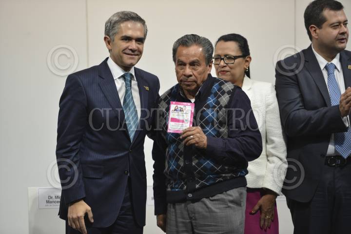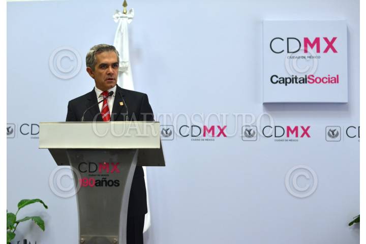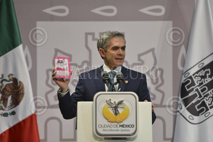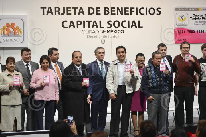 MÉXICO, D.F., 17DICIEMBRE2013.- Miguel Ángel Mancer, jefe de gobierno del Distrito Federal, en la ceremonia de entrega de la Tarjeta de beneficios Capital Social, que tendrá como propósito ofrecer descuentos en línea, seguros gratuitos, atención médica a bajo costo, promociones y cortesías a toda la población entre 18 y 67 años que residen en el DF desde hace tres años. FOTO: ADOLFO VLADIMIR /CUARTOSCURO.COM