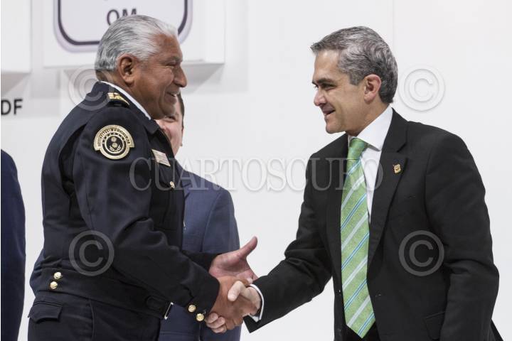 MÉXICO, DF., 18DICIEMBRE2013.- Raúl Esquivel, director general del Cuerpo de Bomberos, saluda a Miguel Ángel Mancera, jefe de Gobierno local, durante la entrega de equipo de protección a bomberos. FOTO: ISAAC ESQUIVEL /CUARTOSCURO.COM