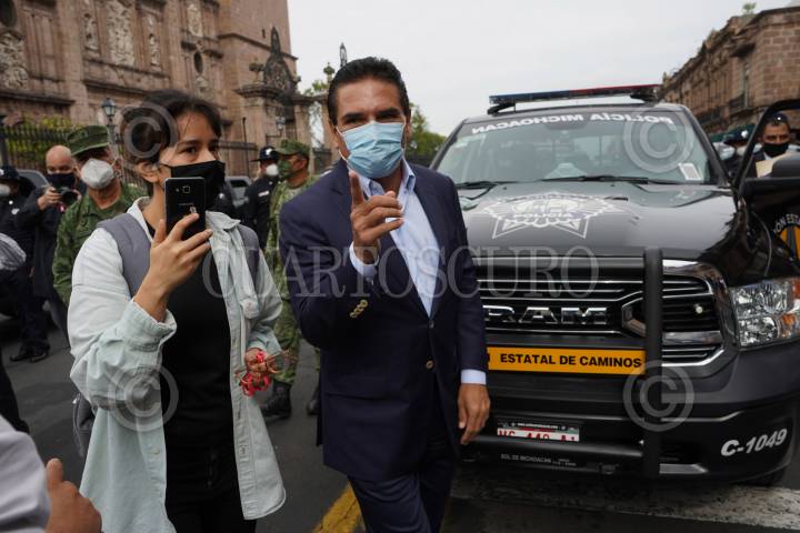 Silvano Aureoles Conejo, gobernador de Michoacán, durante su llegada a la entrega de 50 patrullas de la Policía Estatal de Caminos