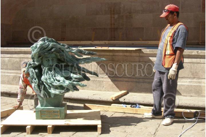 ZACATECAS, ZACATECAS, 24JUNIO2014.- Una escultura en bronce del pintor fresnillense Francisco Goitia (Patillos, Fresnillo, Zacatecas, 1892-1960, Xochimilco, México, D.F.) en la fuente de la plaza Homónima, en esta ciudad. FOTO: JAIME ROBLEDO MARTINEZ /ESPECIAL CUARTOSCURO.COM