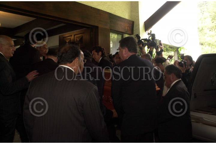 Momentos en los que es transladado el ferétro de Carlos Hank González al interior de su casa, donde será acompañado por familiares y amigos. FOTO: Christian Palma/CUARTOSCURO.COM