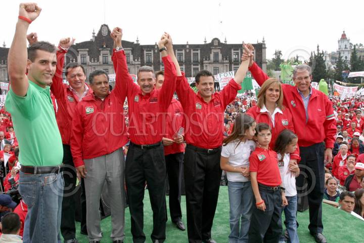 TOLUCA, EDO. MEX. 25JUNIO2005.- Jorge Emilio Gonález Martínez, presidente nacional del PVEM, Miguel Osorio Chong, gobernador de Hidalgo, Fidel Herrera, gobernador de Veracruz, Roberto Madrazo, presidente nacional del PRI, Enrique Peña Nieto, candidato a la gubernatura del estado, y Arturo Montiel, gobernador del Estado de México estuvieron presentes en el cierre de campaña del priísta Enrique Peña en la plaza central de la entidad. FOTO: Juan Flores/CUARTOSCURO.COM