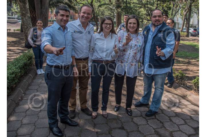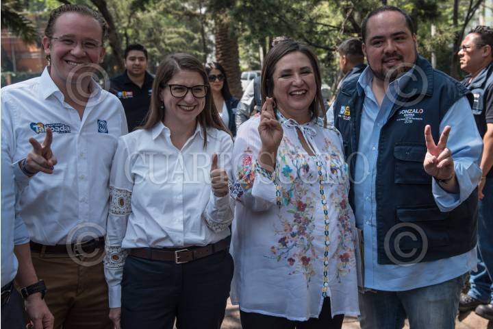CIUDAD DE MÉXICO, 23MAYO2018.- Xóchilt Gálvez, candidata para senadora por la Alianza "Por la Ciudad de México al Frente", acompañada los candidatos a Alcaldes en Miguel Hidalgo, Benito Juárez y Cuajimalpa: Magui Fisher, Santiago Taboada y Gonzalo Espina, presentó la Propuesta Contra la Corrupción Inmobiliaria, la cual busca impedir se construyan más inmuebles que no cumplan con los requisitos de la ley. FOTO: MARIO JASSO /CUARTOSCURO.COM