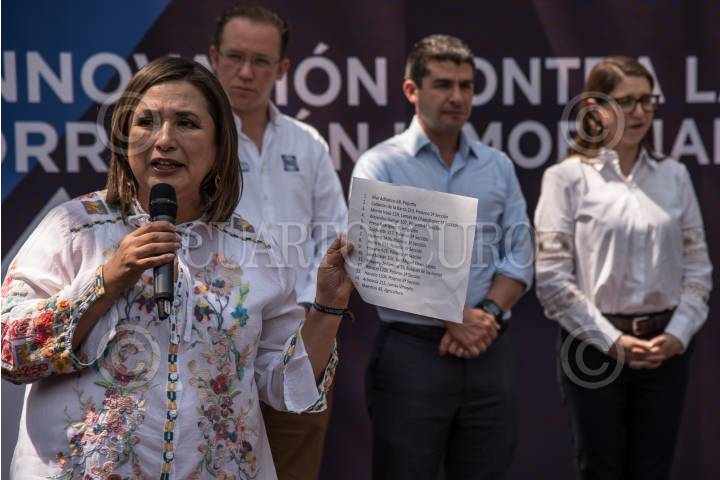 CIUDAD DE MÉXICO, 23MAYO2018.- Xóchilt Gálvez, candidata para senadora por la Alianza "Por la Ciudad de México al Frente", acompañada de Mauricio Tabe, presidente del PAN en la capital, y los candidatos a Alcaldes en Miguel Hidalgo, Benito Juárez y Cuajimalpa: Magui Fisher, Santiago Taboada y Gonzalo Espina, presentó la Propuesta Contra la Corrupción Inmobiliaria, la cual busca impedir se construyan más inmuebles que no cumplan con los requisitos de la ley. FOTO: MARIO JASSO /CUARTOSCURO.COM