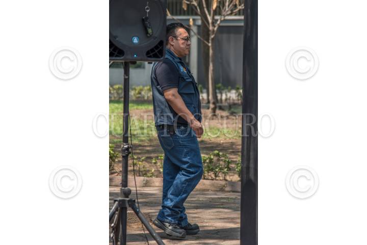 CIUDAD DE MÉXICO, 23MAYO2018.- Se presentó la Propuesta Contra la Corrupción Inmobiliaria, la cual busca impedir se construyan más inmuebles que no cumplan con los requisitos de la ley. Ante el clima de violencia por los recientes asesinatos a aspirantes políticos en distintas partes del país, un escolta se mantiene al pendiente en los alrededores del evento, cargando de forma discreta en su lado derecho lo que presuntamente es un arma de fuego. FOTO: MARIO JASSO /CUARTOSCURO.COM